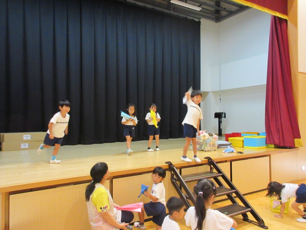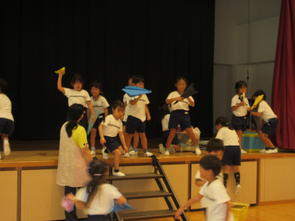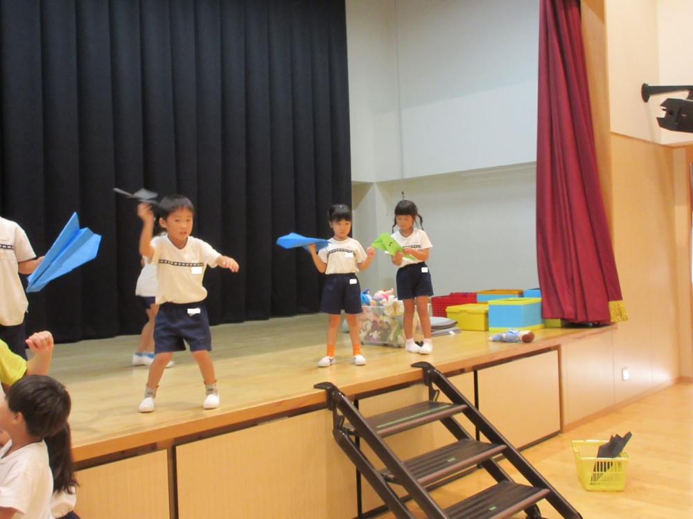 舞台の上から、誰の折った飛行機が遠くまで飛ぶか、競争しました。