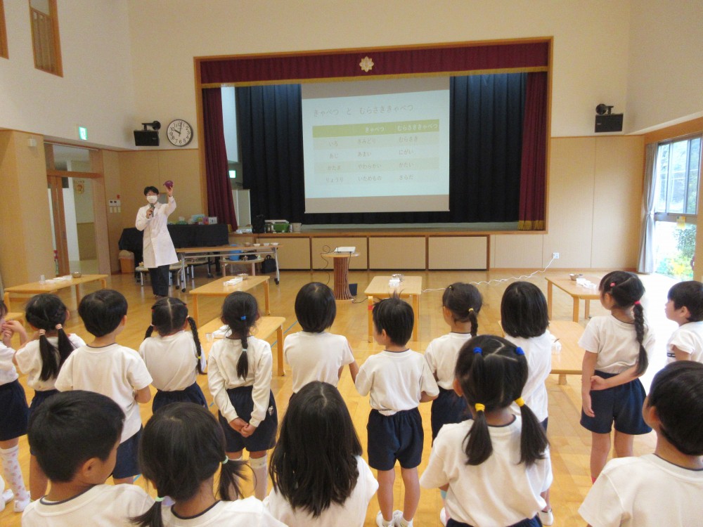 毎日おいしい給食を作ってくれるウェルビーフードシステムから、今年もお兄さん先生が来てくださり、『食育講座』を行いました。