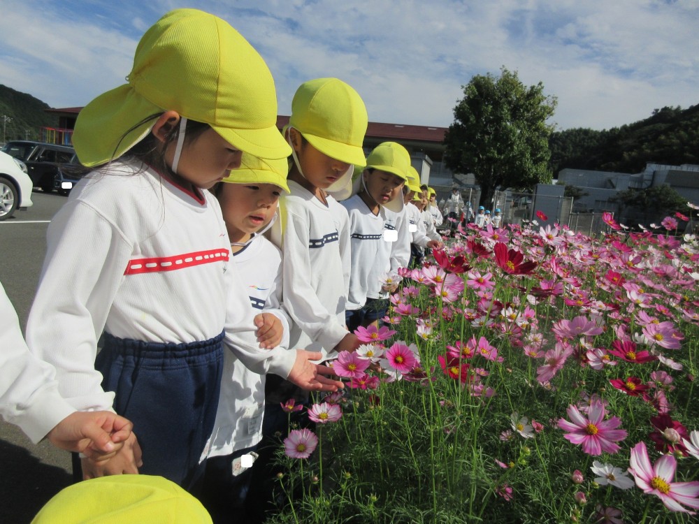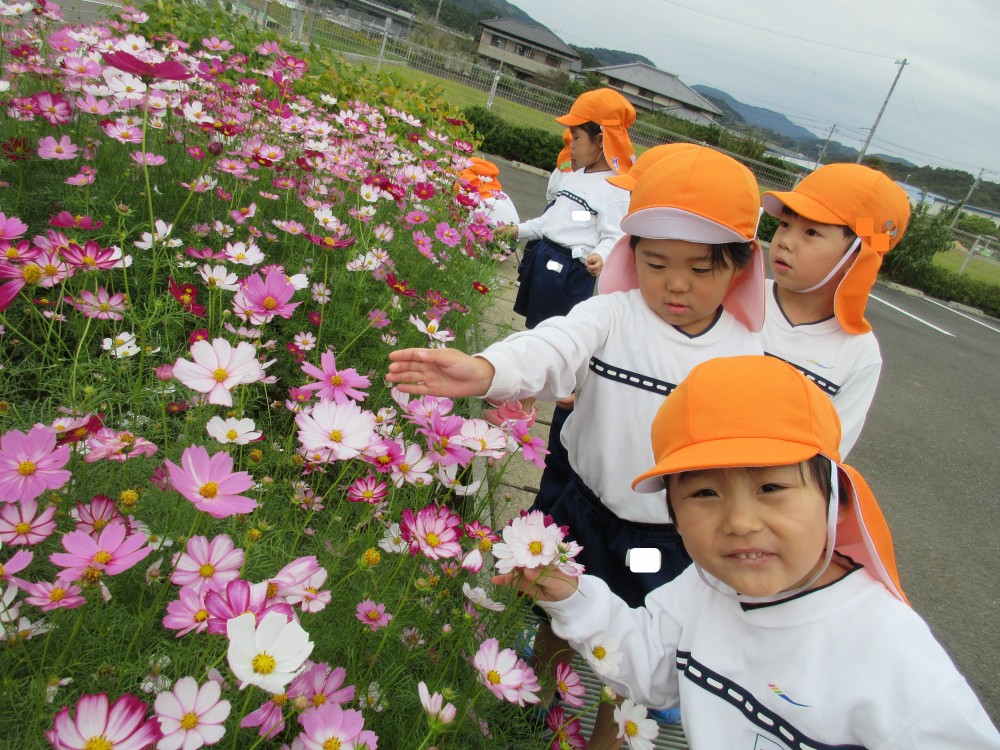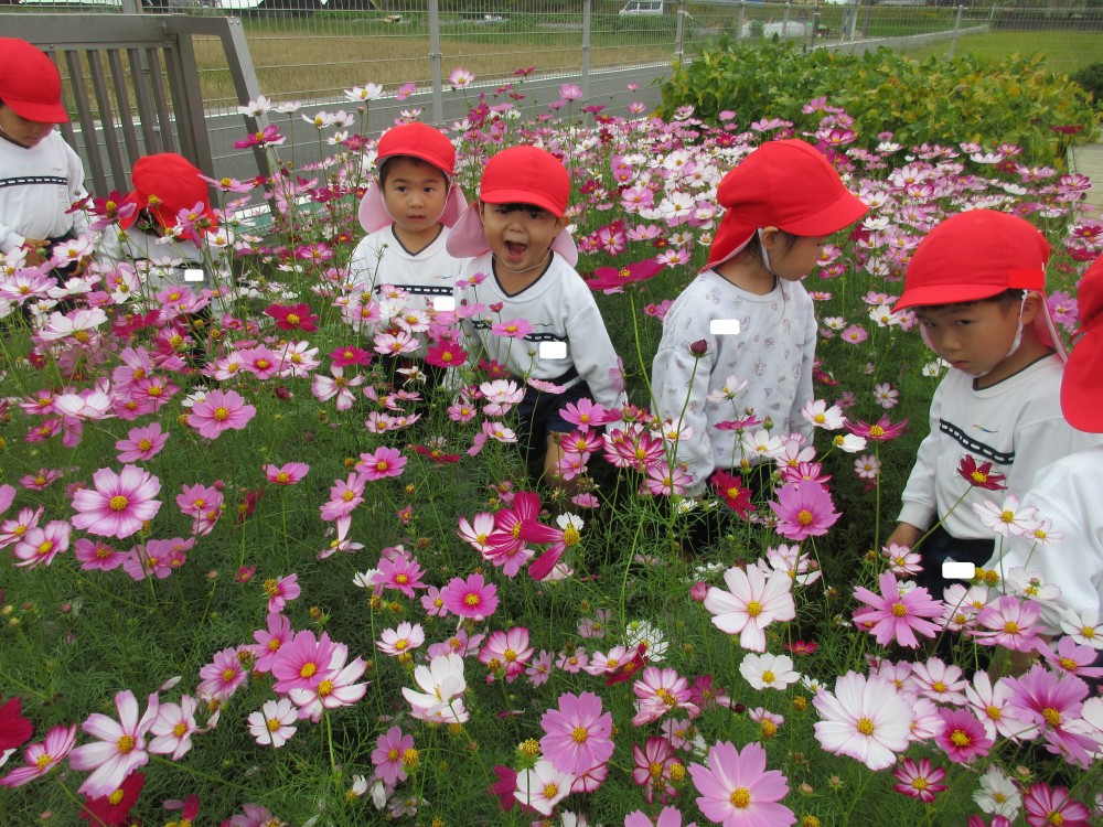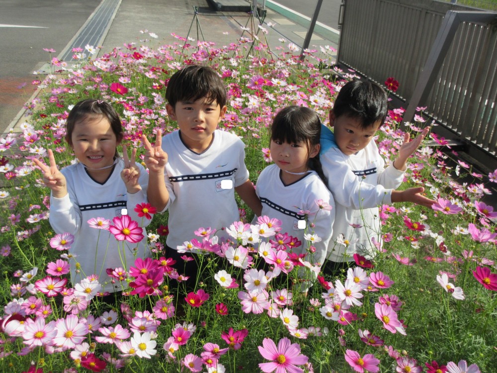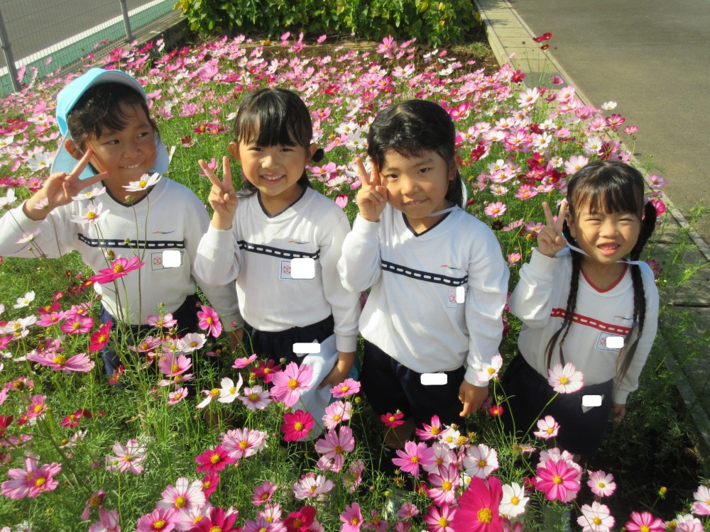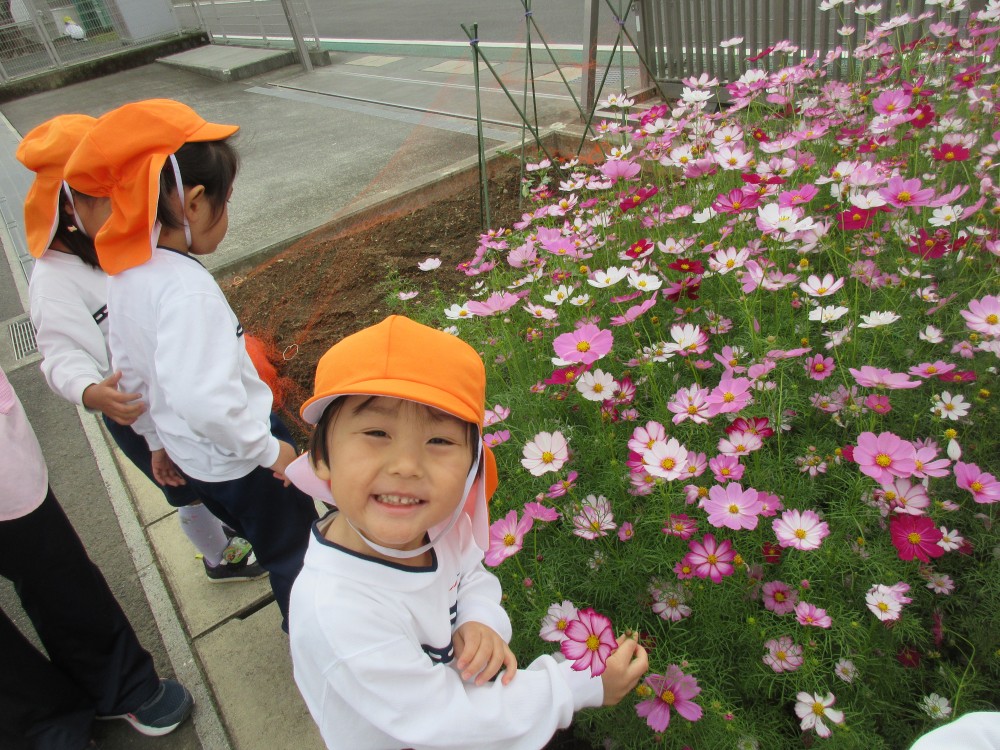 事務長さんが園の畑に蒔いてくださったコスモスの種がきれいに花を咲かせています。
