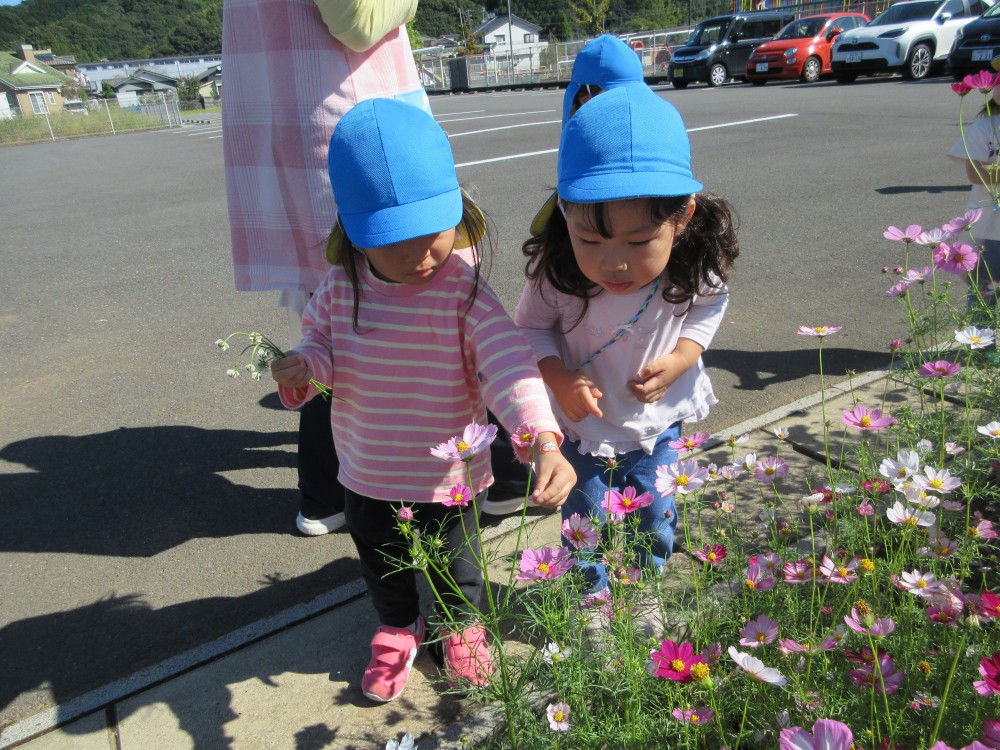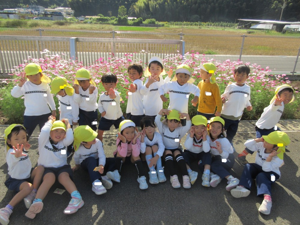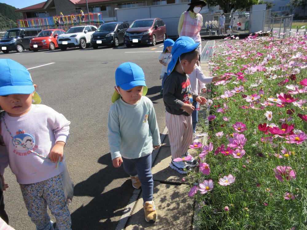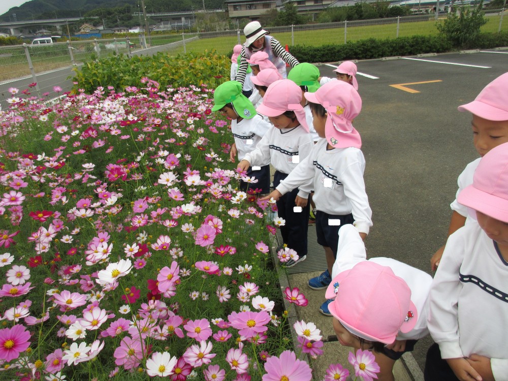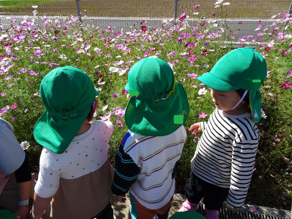 事務長さんが園の畑に蒔いてくださったコスモスの種がきれいに花を咲かせています。