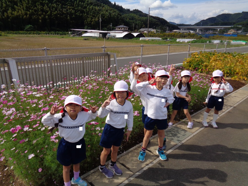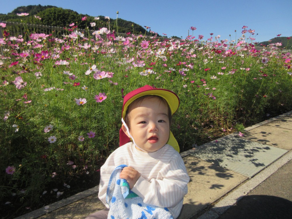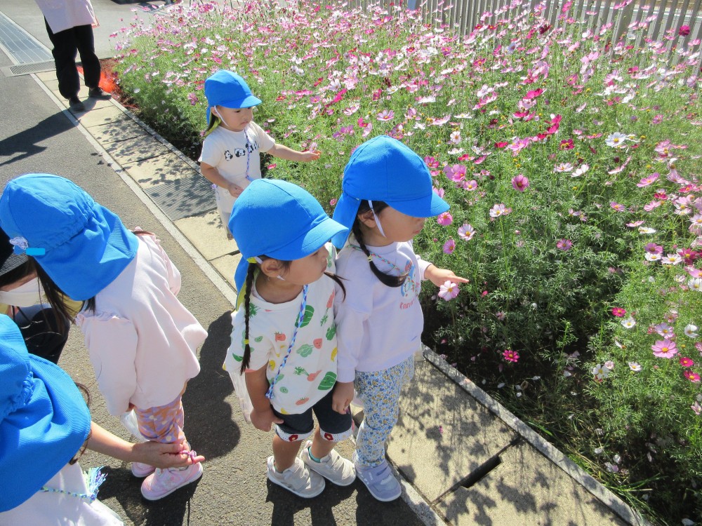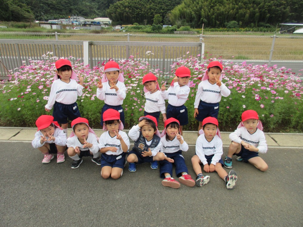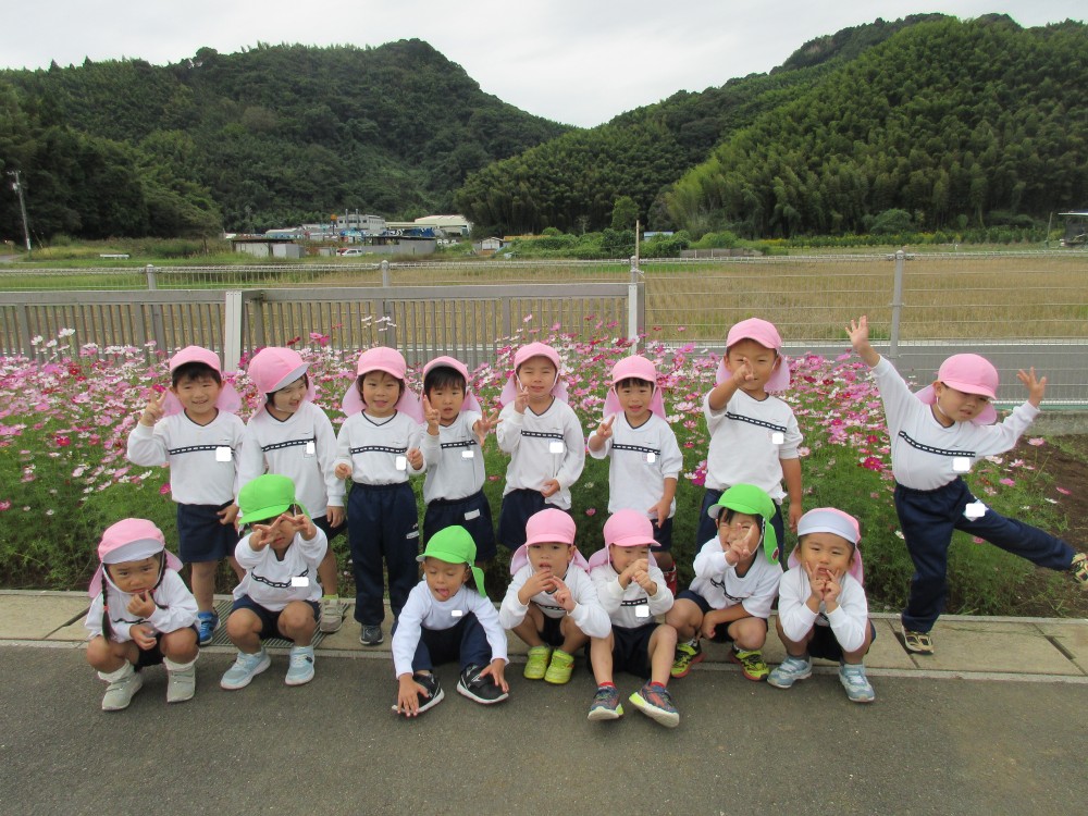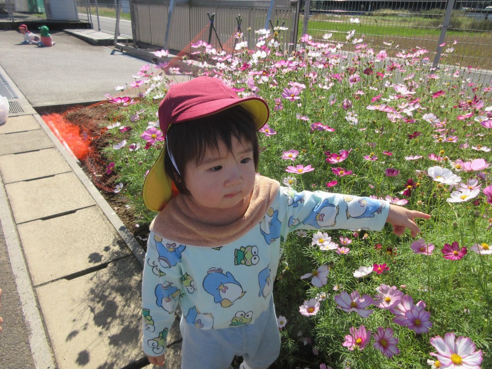 事務長さんが園の畑に蒔いてくださったコスモスの種がきれいに花を咲かせています。
