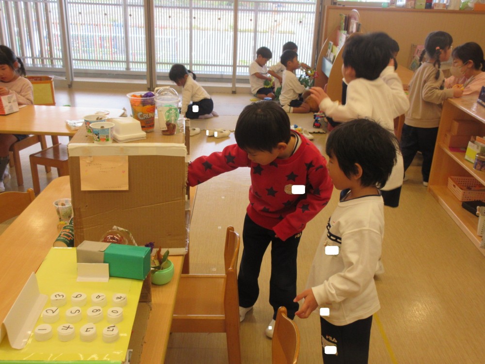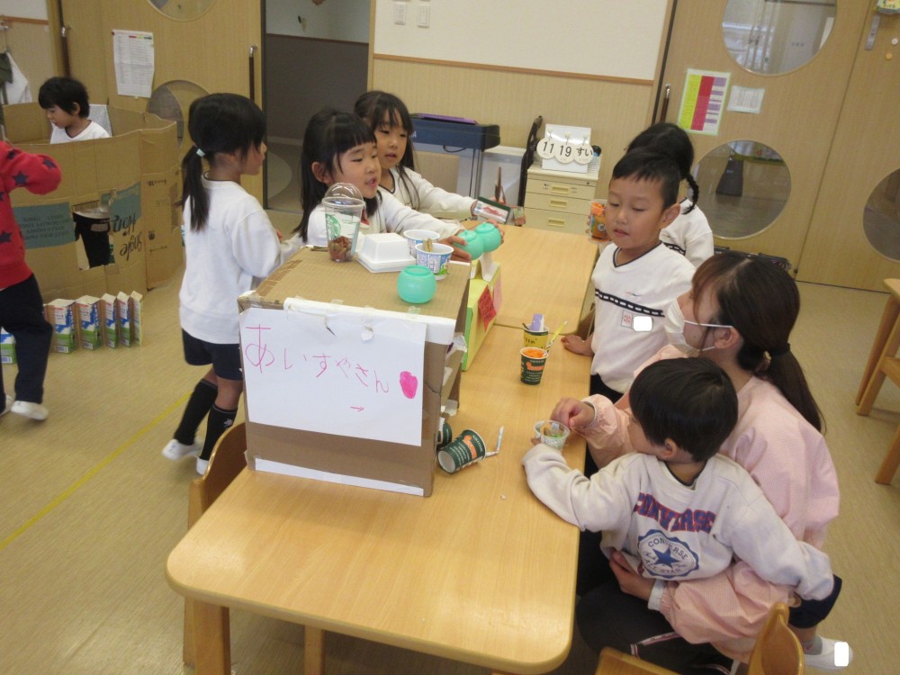製作コーナーでは、アイス屋さんのメニュー作りに取り組んでいる子、猫を作っている子がいました。