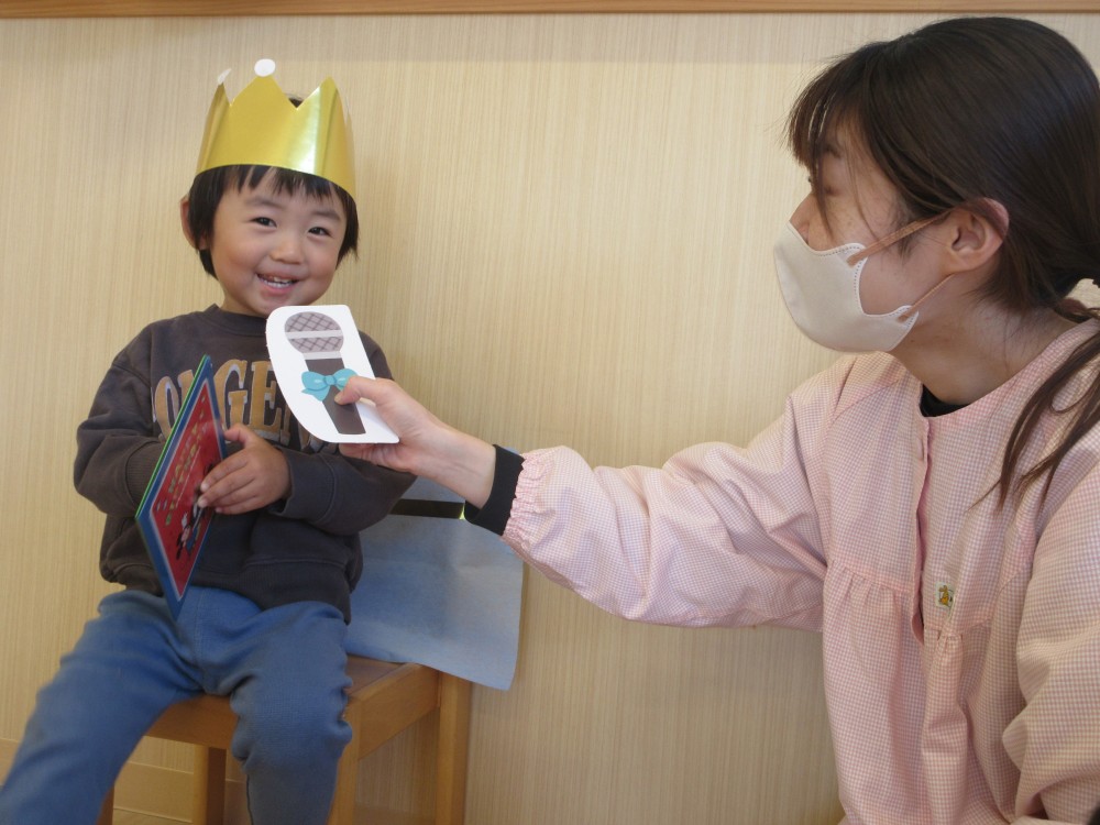 元気に名前を言って、先生からプレゼントのカードをもらいました。