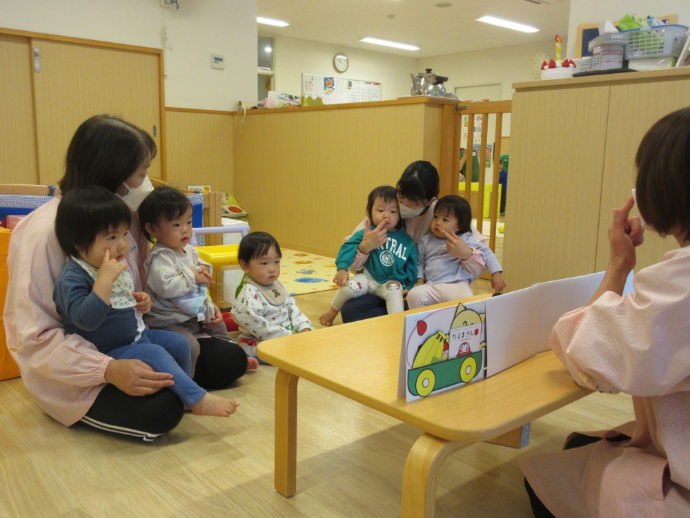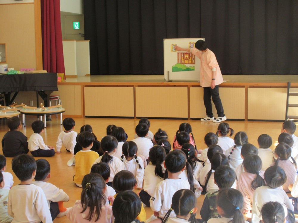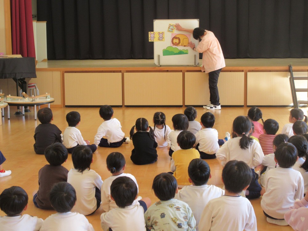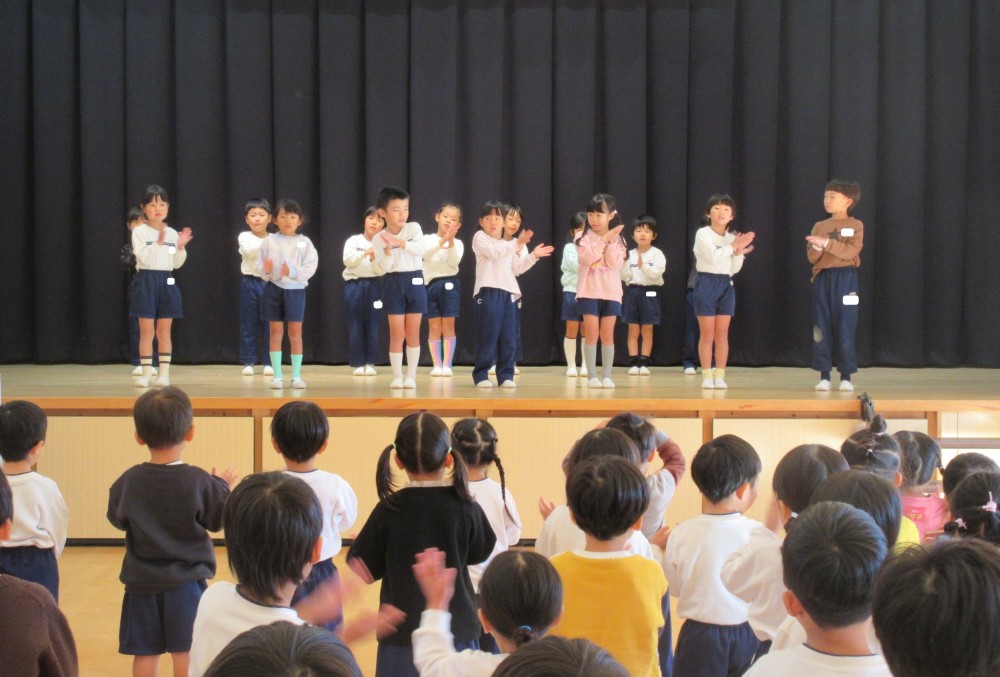 次に、年長組のお友だちが先生になって『ねずみのふとん』の手あそびを教えてくれました![]()
