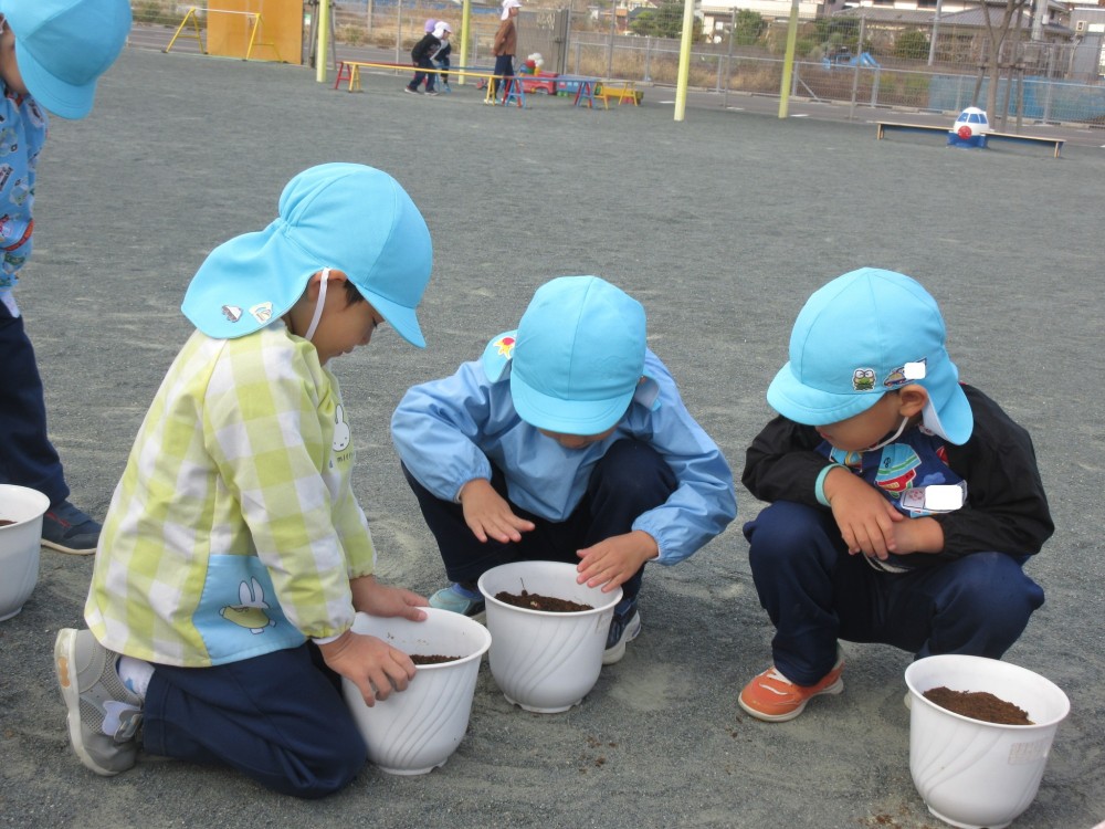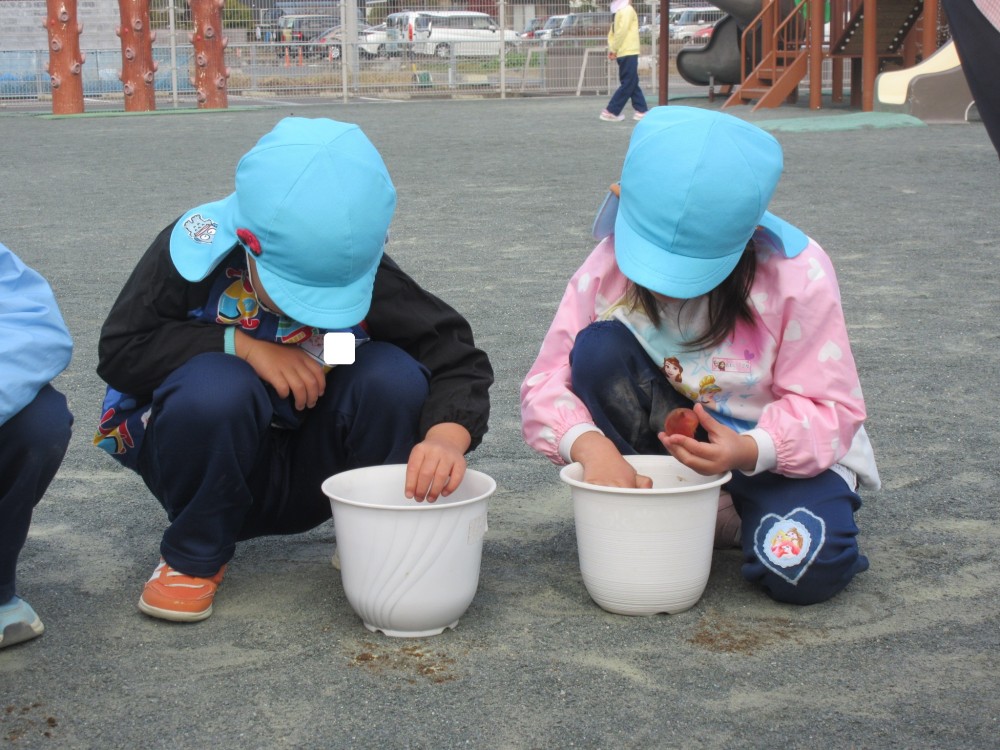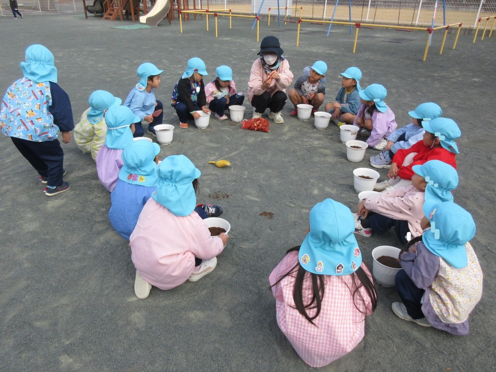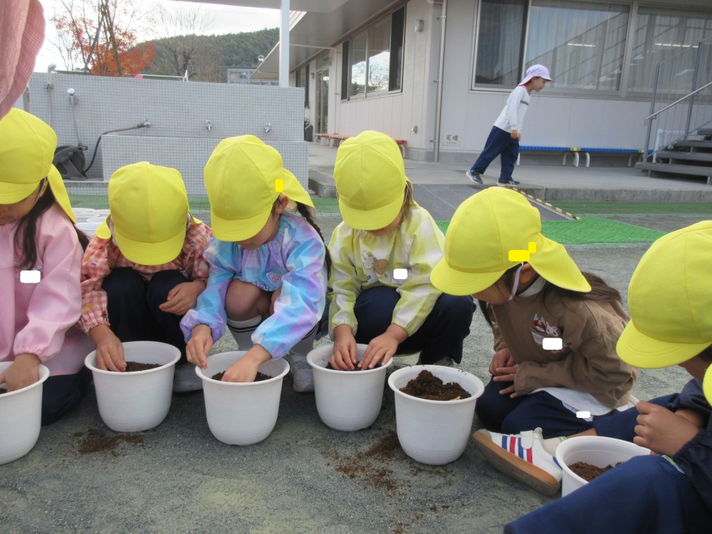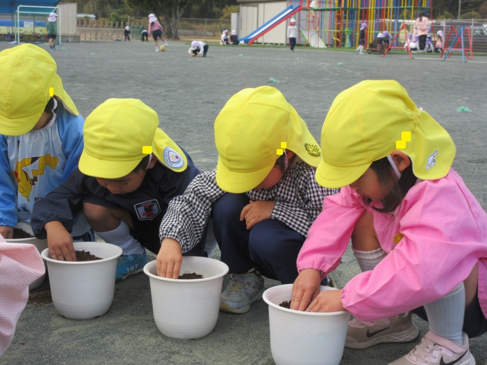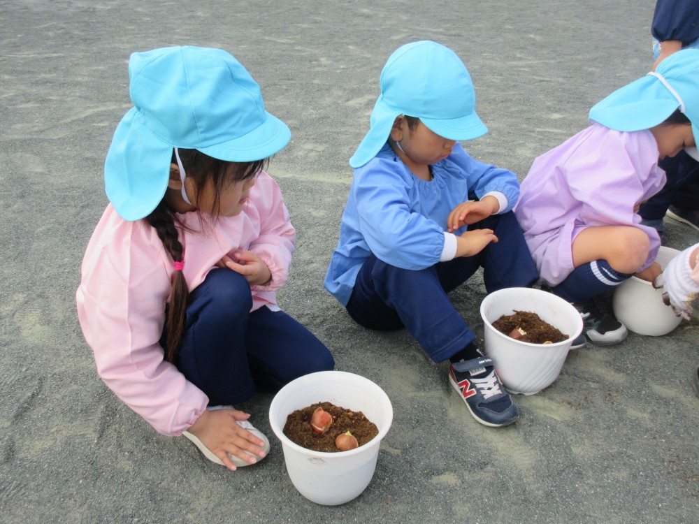 年中組が、チューリップの球根を植えました。ふかふかの土をそっと掛けたあとは、水かけをし、これからみんなで育てていきます。