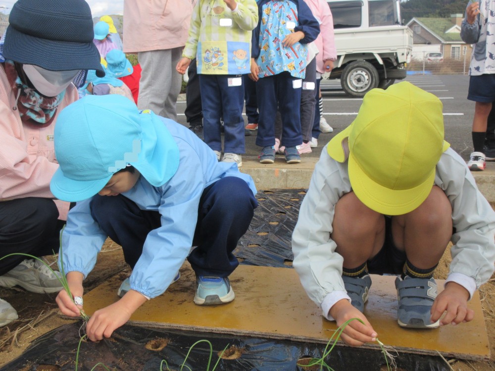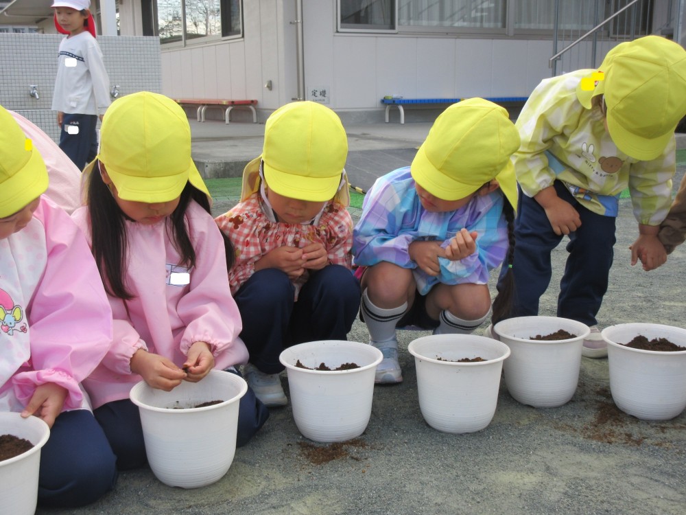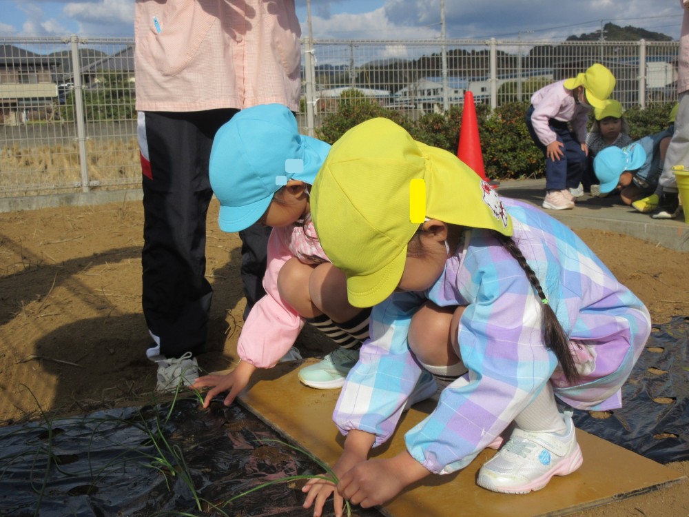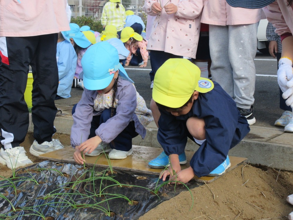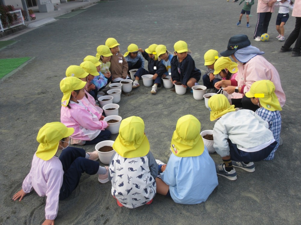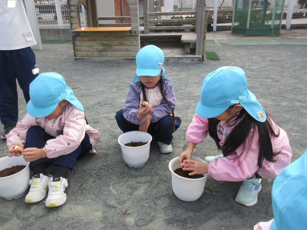 年中組が、チューリップの球根を植えました。ふかふかの土をそっと掛けたあとは、水かけをし、これからみんなで育てていきます。