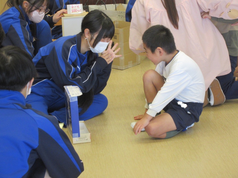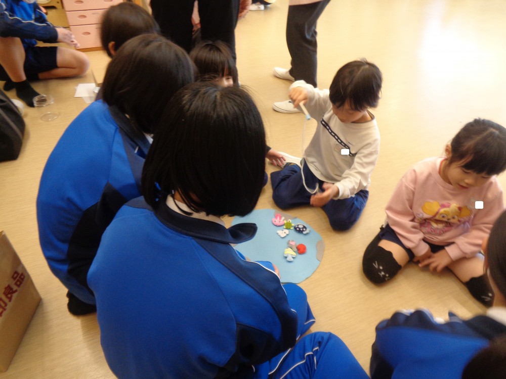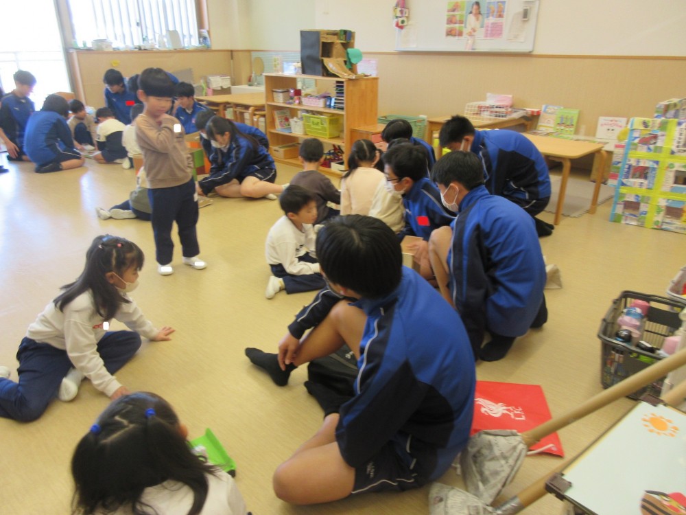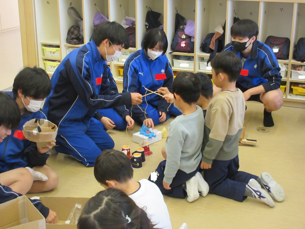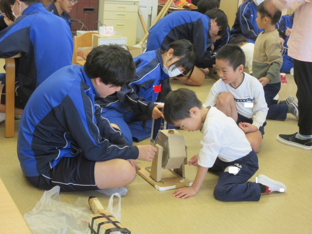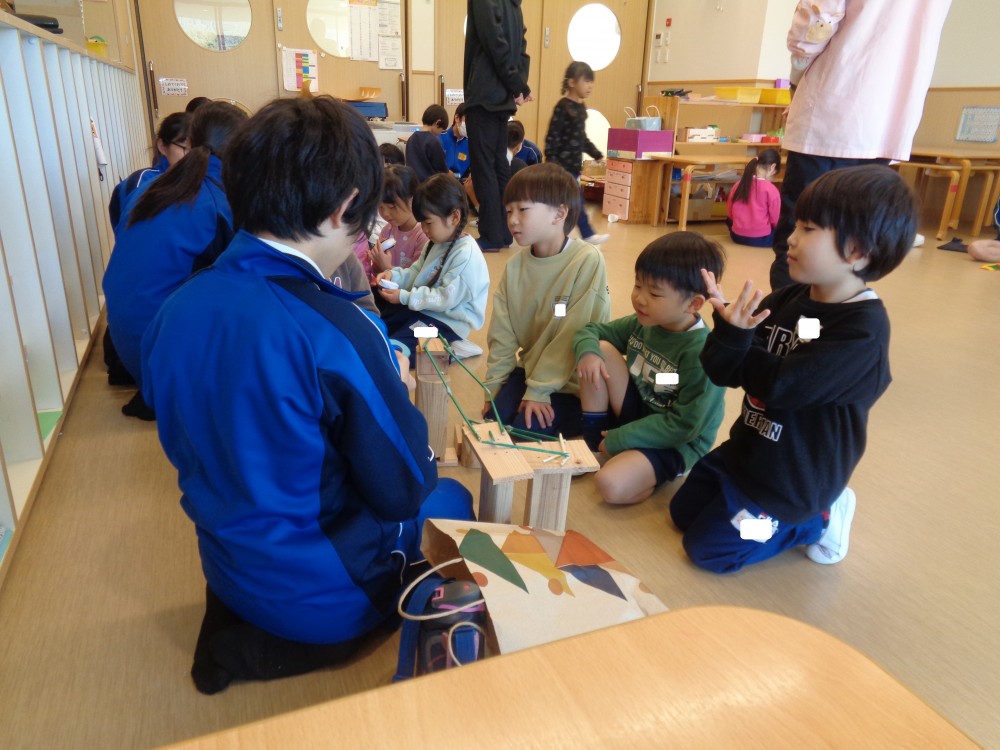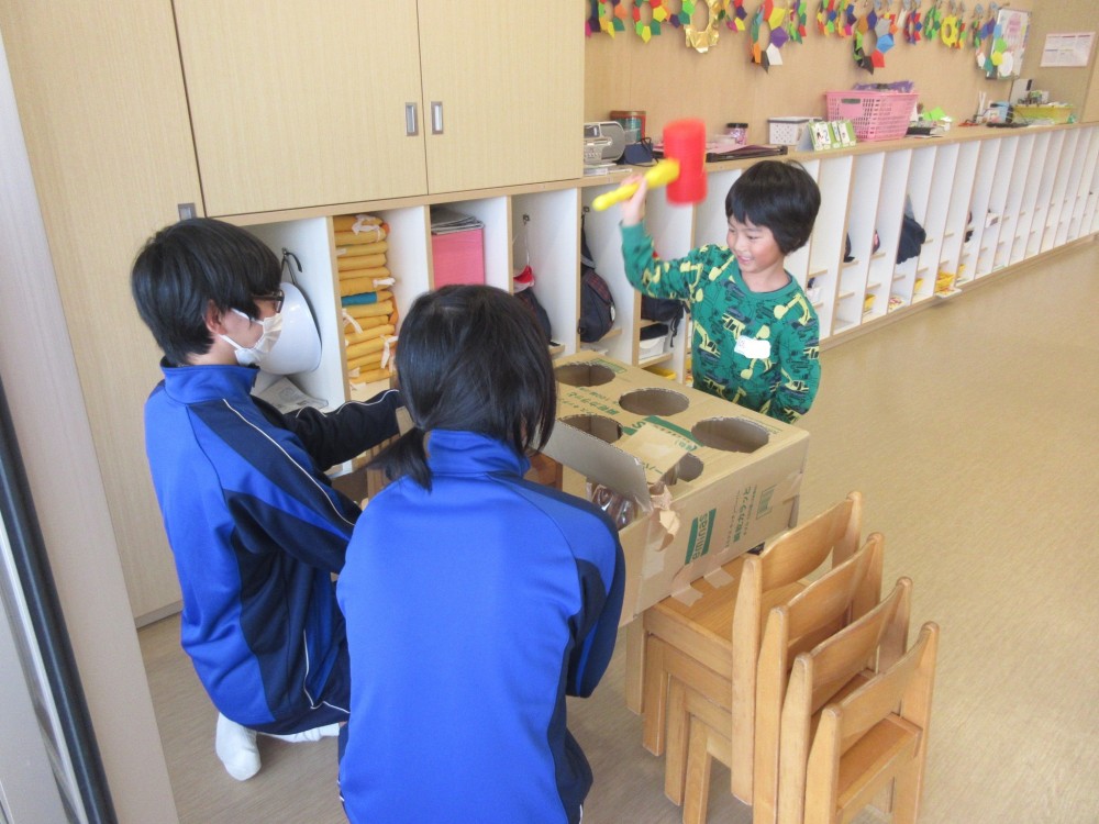 今年も、葉梨中学校3年生が、技術・家庭科の授業で作った手作りおもちゃを持って、年長クラスにあそびにきてくれました。わくわくするようなおもちゃが盛りだくさんで、みんな夢中になってあそんでいました