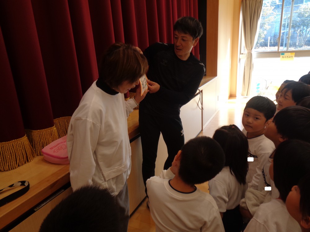そして、年長組は今日が最後の体操あそびでした。体操あそびが終わったあと、今までお世話になった朝比奈先生・じゅんや先生に、感謝の気持ちを込めてお手紙を渡しました。