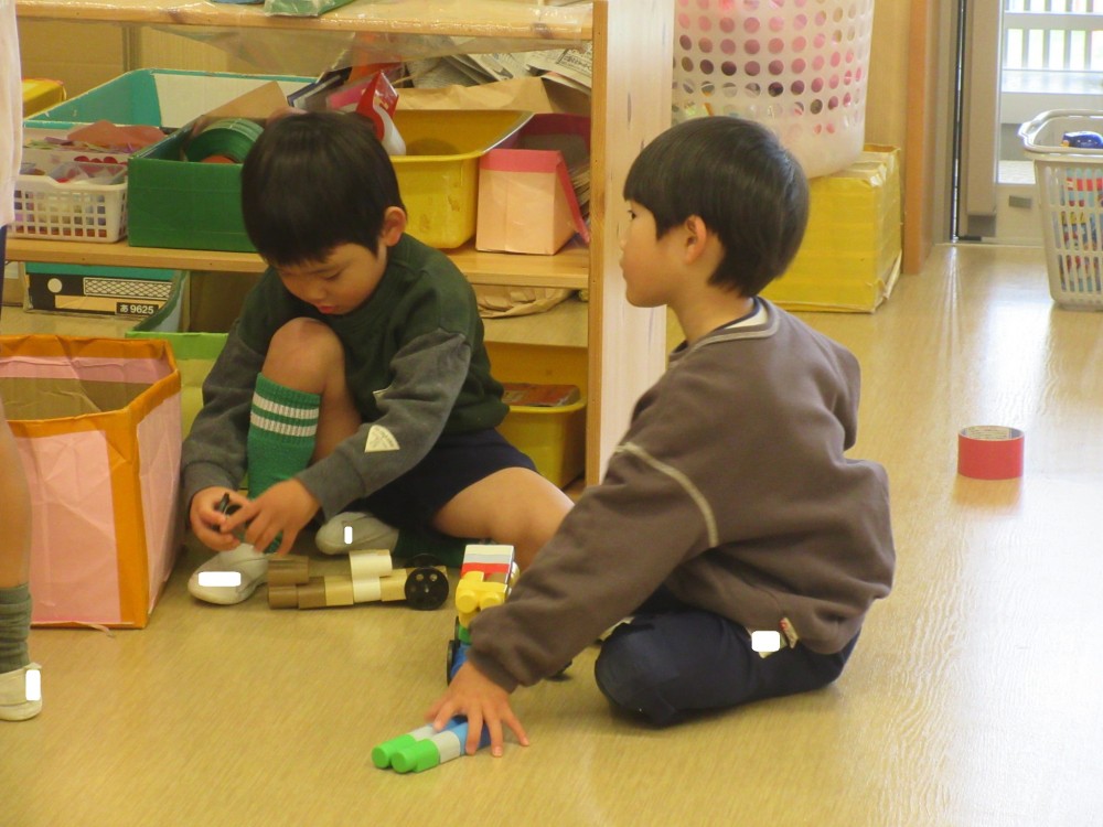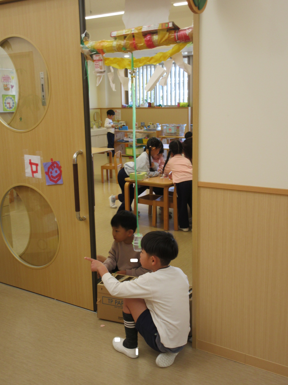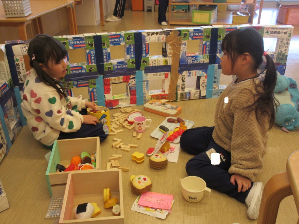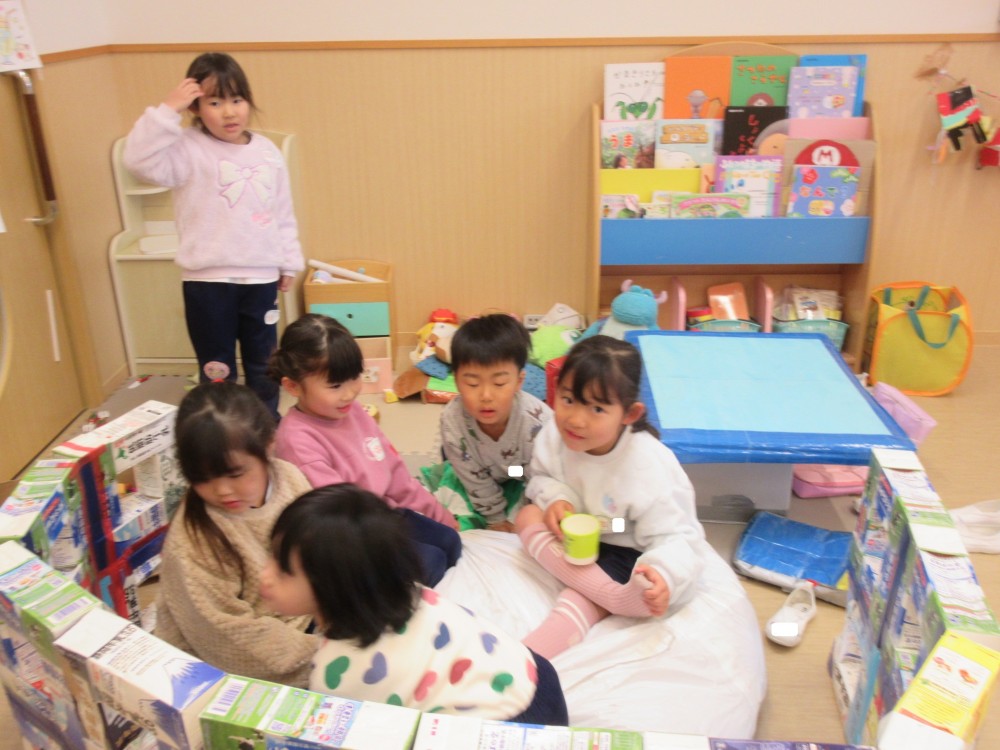 すみれ組に立派な神社ができました。2学期末に、トンネルづくりから神社をつくろうということになって始まったあそびです。お散歩で、神社を見に行ったりしました。年明け、初詣に行った家庭での経験から更にあそびが広がり、他クラスからもお友だちがお参りに来ています⛩