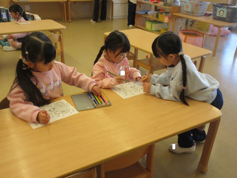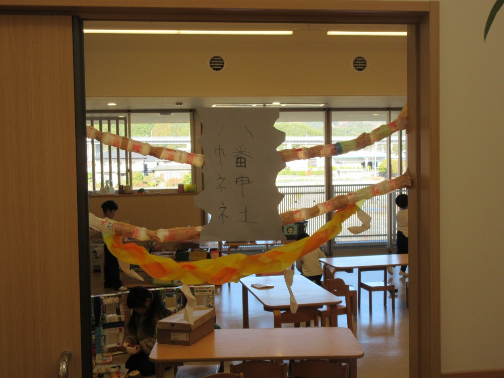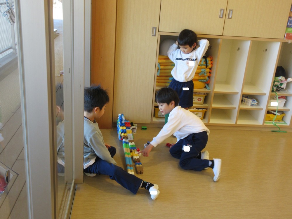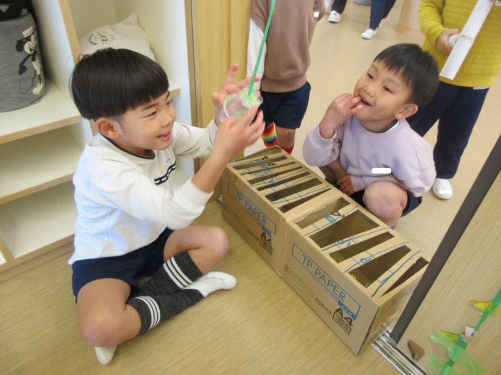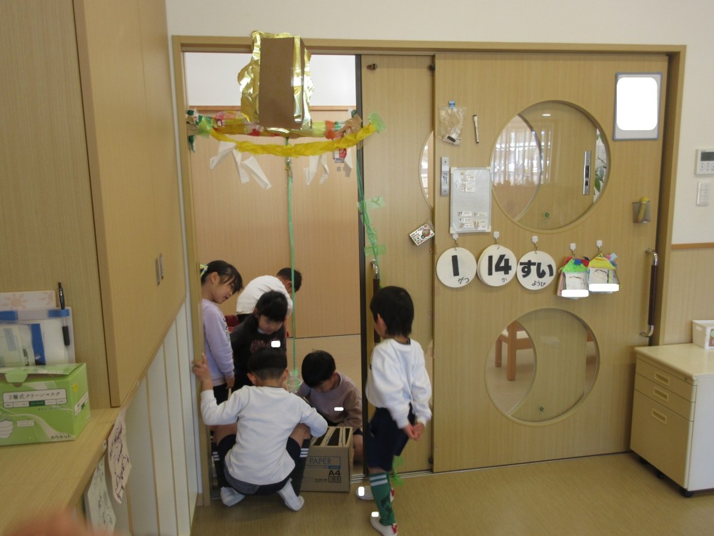 すみれ組に立派な神社ができました。2学期末に、トンネルづくりから神社をつくろうということになって始まったあそびです。お散歩で、神社を見に行ったりしました。年明け、初詣に行った家庭での経験から更にあそびが広がり、他クラスからもお友だちがお参りに来ています⛩