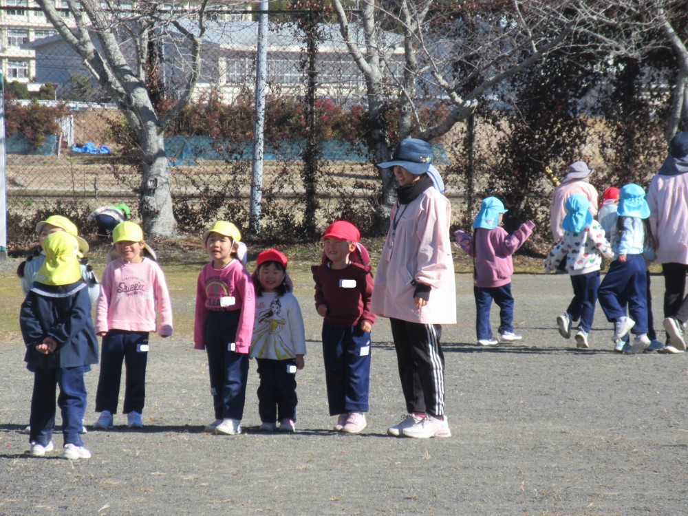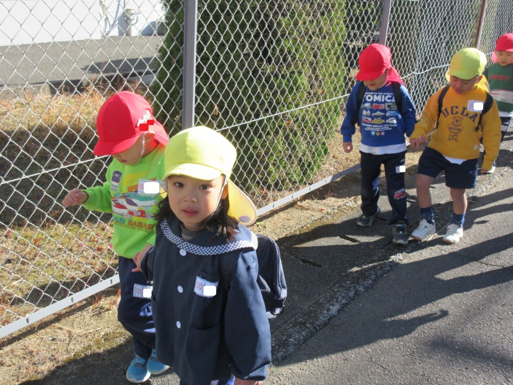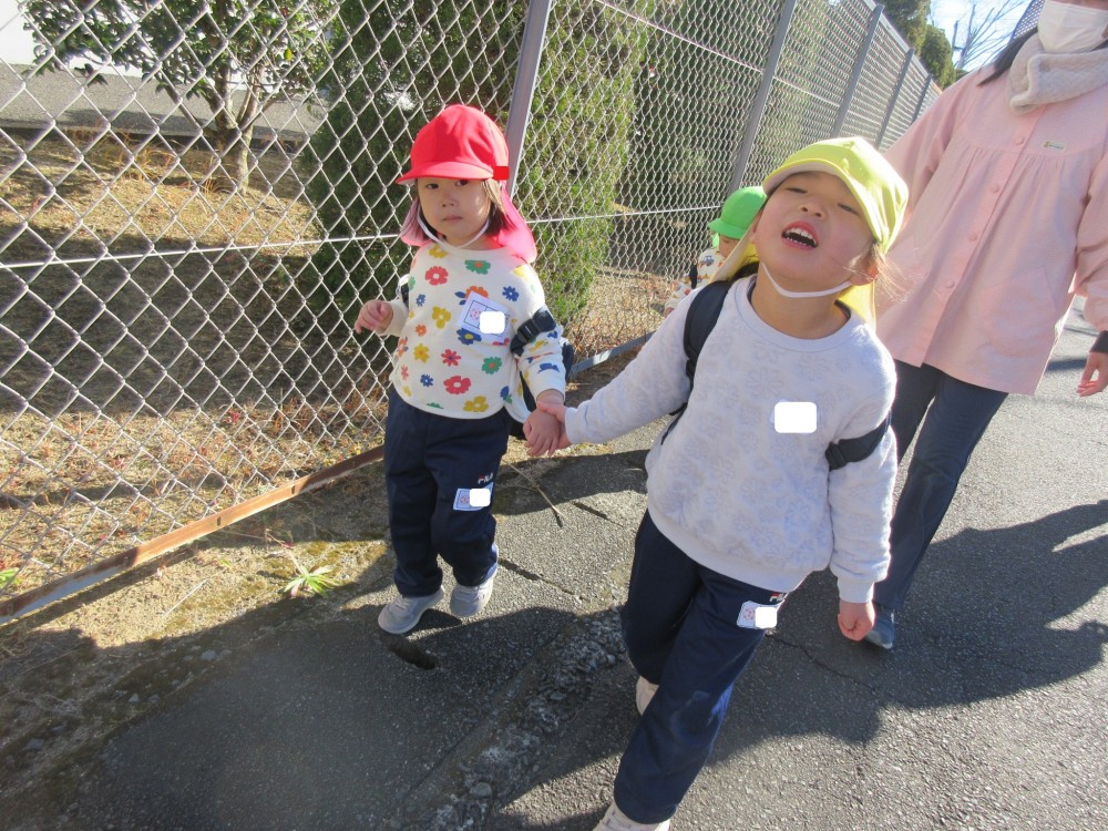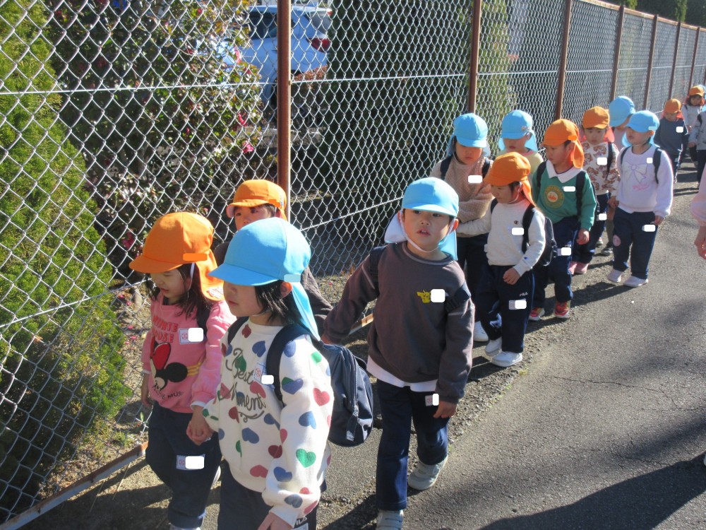 年中・年少組は、ペアのお友だちと手を繋いで、お散歩に出掛けました。